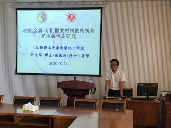 2020年9月24日上午,江西理工大学化学化工学院副院长、副教授,博士生导师刘遂军来我院作题为《功能金属-有机框架材料的制备与光电磁性质研究》的学术报告。
