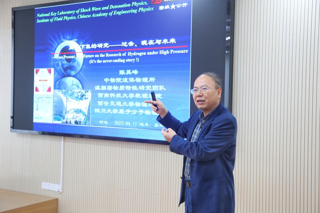 陈其峰研究员首先阐释了国内外高压下氢的研究历史和现状,并对未来高压下氢的研究趋势作了展望。随后陈其峰着重介绍了自己带领的温稠密物质特性研究团队在冲击波物理与爆轰波物理国防重点实验室所做的工作,这些工作为建立高压下氢的物性参数理论计算模型提供了多视角的评估。最后,我院李溪教授与陈其峰研究员围绕“高压下氢与纳米材料”进行了热烈的学术探讨,通过学术思想碰撞,极大地激发了我院师生在相关领域的科研热情。