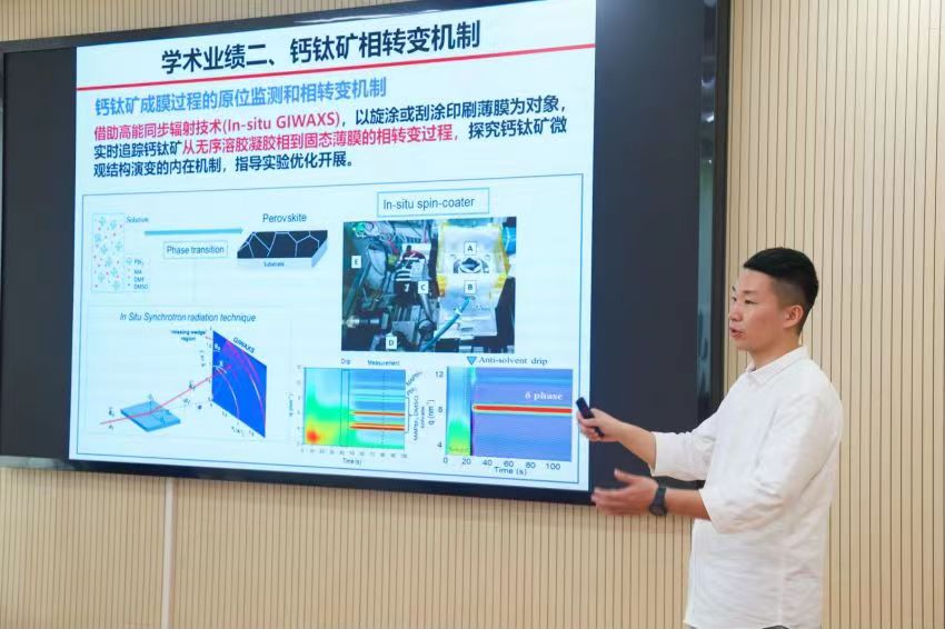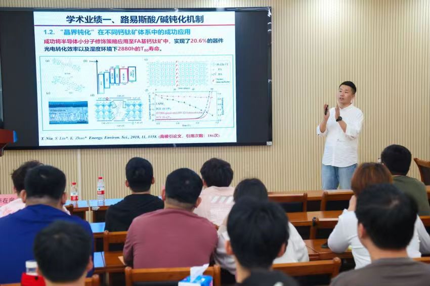 牛天启博士从新型电荷传输材料分子结构设计改性以及稳定高效钙钛矿太阳电池器件制备的角度着手,围绕分子界面工程对电荷传输材料结构和性能的调控以及对于钙钛矿界面性质、电荷传输动力学及老化衰减的作用机制,开展有关材料、器件特性与物理机制的交叉研究,为高性能钙钛矿单节/叠层光伏电池的可控制备提供理论指导和技术策略。报告结束后,牛天启博士耐心地解答了现场师生提出的问题,并与李在房教授团队围绕“钙钛矿材料与器件”进行了热烈的学术交流。