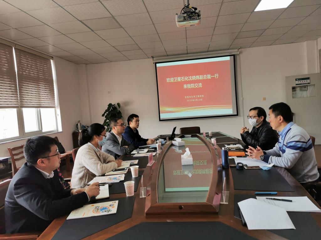为进一步加深校企交流与合作,2020年4月14日上午,浙江卫星石化股份有限公司(以下简称卫星石化)副总裁沈晓炜、研发中心副主任刘睿、研发中心副主任程甜甜和人资中心副经理杨大伟一行来我院交流,学院领导周宏伟院长、张瑾副院长参加座谈。