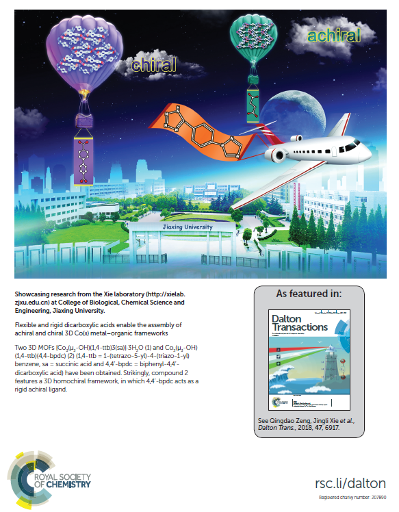 性爱视频 谢景力课题组(//xielab.videossex.net)巧妙地运用刚性有机配体4, 4’-联吡啶存在一定的扭自由度,成功合成均一手性金属有机框架化合物。论文题目为:Flexible and rigid dicarboxylic acids enable the assembly of achiral and chiral 3D Co(II) metal-organic frameworks, 该研究进展得到审稿人及编辑的积极评价, 以封底论文的形式发表于RSC期刊Dalton Transactions (2018, 47, 6917-6923), 第一作者为课题组成员宫春华(现为郑州大学博士研究生)