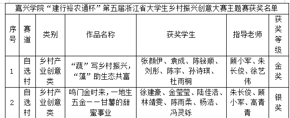 据悉,浙江省大学生乡村振兴创意大赛是浙江省大学生科技竞赛赛项之一,包括主体赛和专项赛。今年大赛以“创意,让乡村更美好”为主题,坚持“乡村出题、高校答题、真题真做、成果落地”的理念,让学生把课堂搬到田野里,把论文写在大地上,取得了实践育人的成效。近几年来,我院在乡村振兴创意大赛中成果突出,共获得金奖2项、银奖2项。