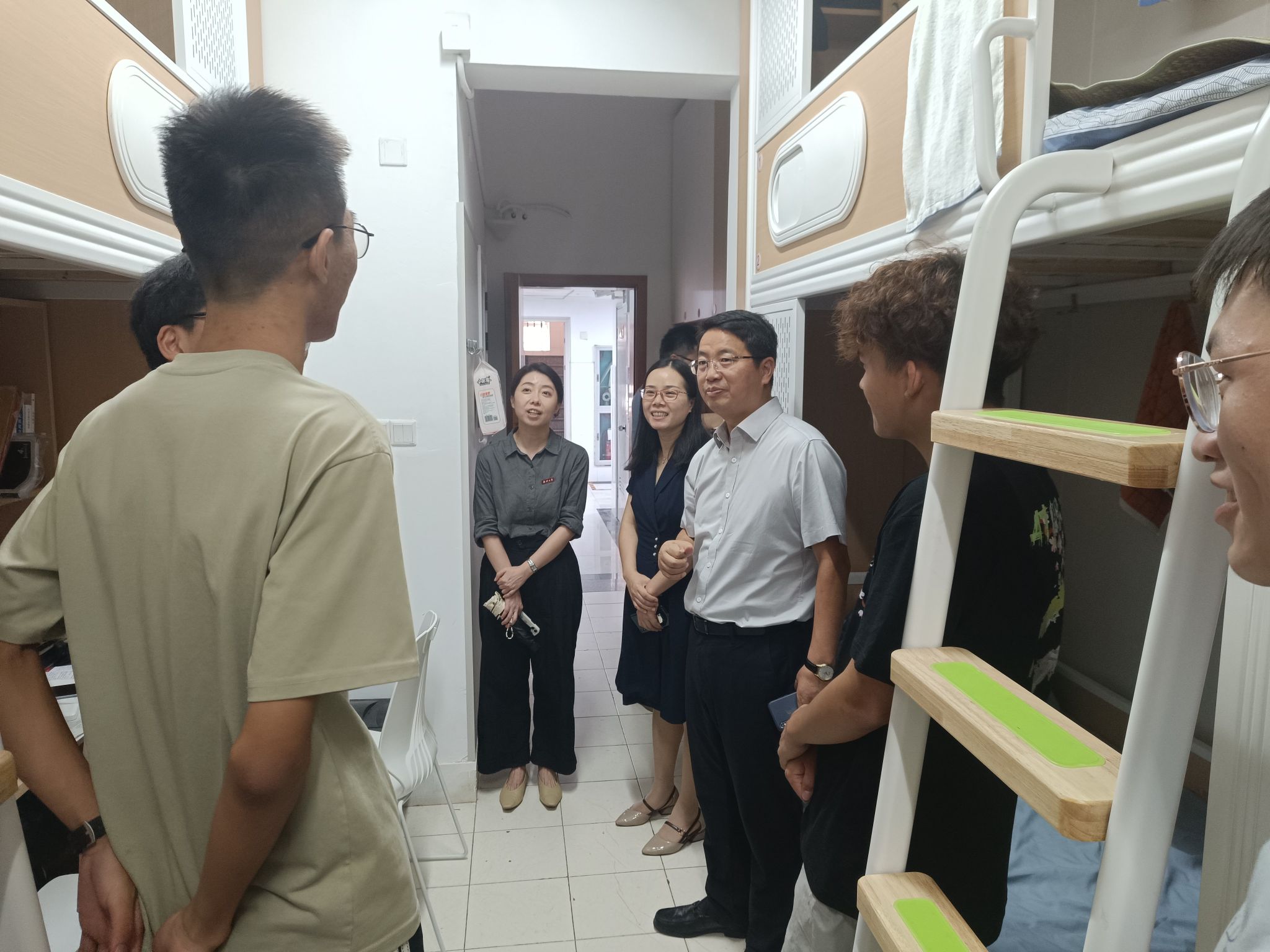 於建明与同学们进行了面对面、亲切的交流,详细询问了大家的成长经历、报到情况、入校感受、大学规划等,他提醒新同学要尽快整理好内务、调整好作息,以积极的态度、崭新的面貌投入到大学的学习与生活中。於建明表示,大学四年时间珍贵,他勉励同学们要明确专业学习目标,扎实学习专业知识;要积极锻炼身体,平衡好学习和生活;要及早做好职业规划,为高质量就业创业、进一步深造夯实基础,走出“舒适区”,进入“奋斗区”,最终抵达“无人区”。参加交流的同学备受鼓舞,纷纷表示将以积极的态度投入大学生活,认真学习,全面发展,不辜学校和老师的殷切期望。
