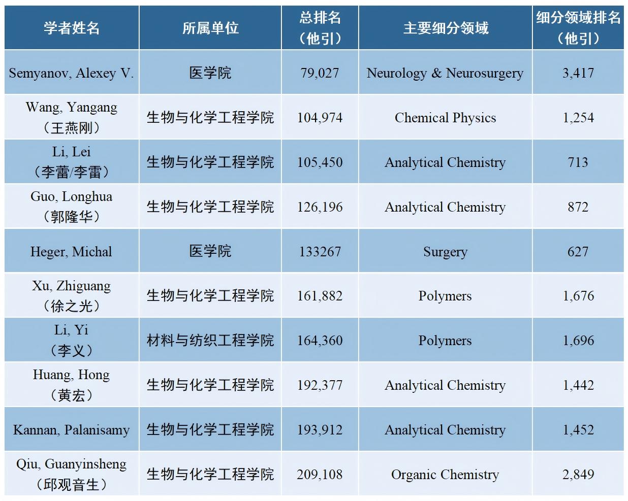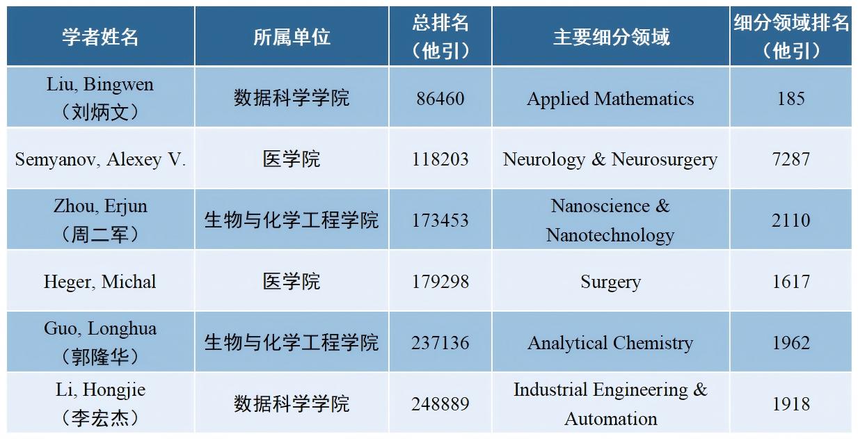 入选“终身科学影响力排行榜”的有:数据科学学院刘炳文、李宏杰,医学院Semyanov Alexey V.、Heger Michal,性爱视频 周二军、郭隆华。