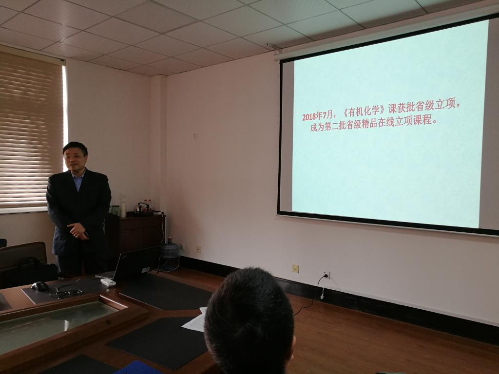 性爱视频 有机化学课程组组长杨义文老师以《有机化学》课程为例,主要从申报书的撰写、慕课的拍摄、网站的维护与使用等方面交流了自己在精品在线开放课程申报与建设方面的经验。随后性爱视频 的优秀青年教师代表邱观音生老师以自己的亲身经历做了一个题为“青年教师如何处理好教学和科研的关系”的简短发言。