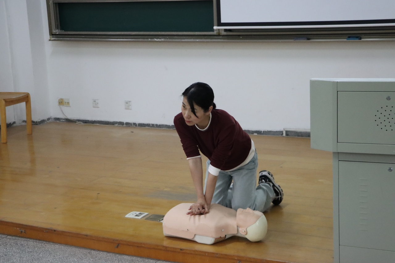 在急救技能实训单元,医学院杨玲飞老师采用“理论+实景”教学模式,重点指导寝室长掌握心肺复苏黄金四分钟处置流程。通过分组演练急救、心肺复苏等操作,参训寝室长现场学习了从应急判断到规范施救的全流程应对方法,为突发状况应对奠定了良好的基础。